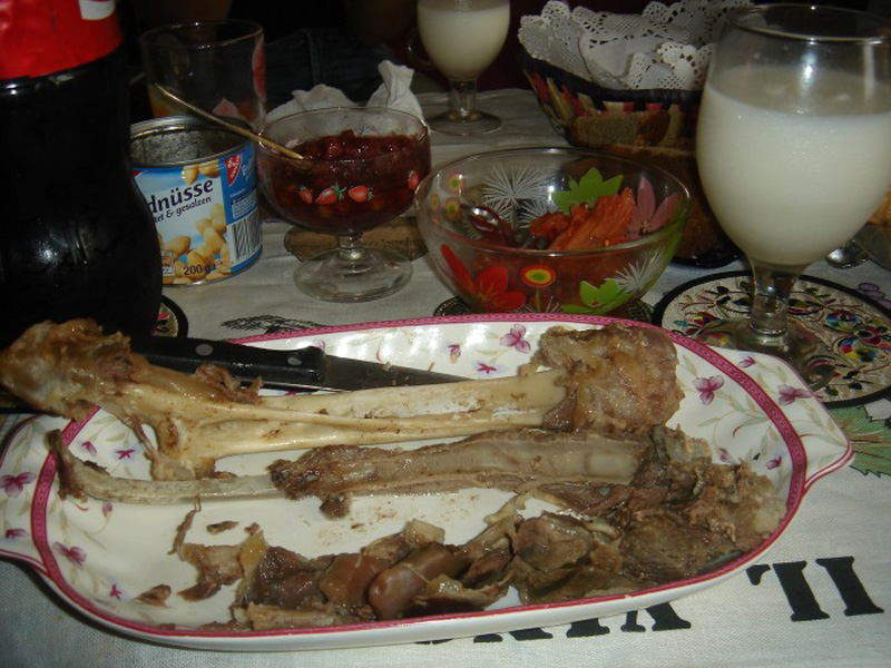 Bugün öğlende Sarançeçeg (anlamı: ay çiçeği) ile birlikte arkadaşı Burmaa’nın (bal) evine gittik, kesif bir koyun eti kokusu vardı, Moğolistan’da her evin böyle koktuğunu duymuştum. Sağ olsun yemek hazırlamış; turşu, koyun eti, mantı çorbası. Koyun eti masaya geldi öylece kaldık, meğer adettenmiş, misafir eti parçalayıp verirmiş. Ben bıçakla kırmızı kısımları kesip yemeye çalışırken hatunlar koca kemikleri iki elle kapıp yağ ve kıkırdak bırakmadılar. Bu arada ilk kımızımı heyecanla içtim. Kımızın buradaki adi AYRAG. Kazak azınlık bizim gibi kımız diyor, ama Moğolcası Ayrag.