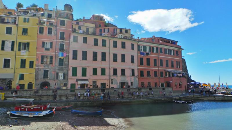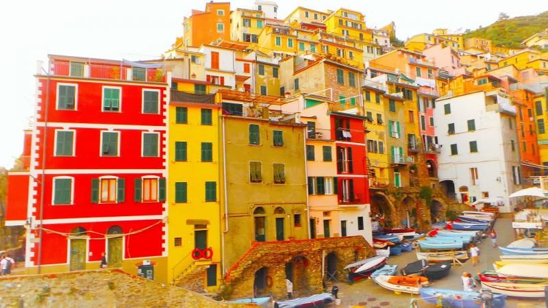 Trenle sırasıyla Monteresso, Vernezza, Cornigla ve Manarola’dan geçtikten sonra Riamaggiore'ye ulaşıyoruz. Trenden indikten sonra yaklaşık 100 metrelik bir tünelden valizlerimizle yürüyerek otelimize ulaştık. Hemen dışarı atıyoruz kendimizi. Küçük bir köy olan Riamaggiore’nin yine küçük bir balıkçı barınağı ve iskelesi var. Manzara ve iskelenin çevresindeki renkli yapılar, etraftaki karaya çekilmiş tekneler ve deniz, sahnelenmekte olan bir operanın sahne dekoruna benziyor.