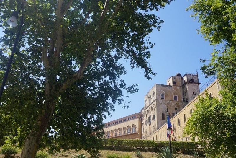 Asırlık ağaçların arasından bahçeyi geçerek, birçok Sicilya Kralı’na ev sahipliği yapmış binaya giriyoruz. Şehrin en muhteşem yapılarından, günümüzde Parlemento Binası olan bina, üç kültürden izler taşıyor. 12. yy.’da Arapların adayı istilası sırasında, cami olarak inşa edilmiş ve tabii Arap mimarisi hâkim, sütun başlıkları ise Bizans mimarisi korint düzeninde. Mermer ve ahşap müthiş bir uyum içinde dans ediyor adeta.