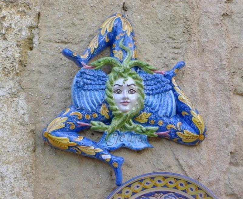 "Üç köşeli yer" anlamına gelen Sicilya Adası’nın sembolü ve bayraklarındaki amblem, etrafında 3 bacaklı ilginç bir kadın figürü olan “Trinacria”. Ortadaki kadın yüzü Medusa’yı, 3 bacak ise adanın 3 noktasını (batı, güney doğu, kuzey doğu) temsil ediyormuş. “Neden kadın bacakları?” derseniz “ada kıyıları kadın bacakları kadar güzel” olduğu içinmiş. Bu amblem, hediyelik eşyada ve birçok yerde karşınıza çıkacak.