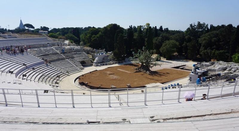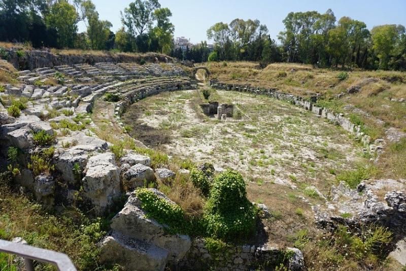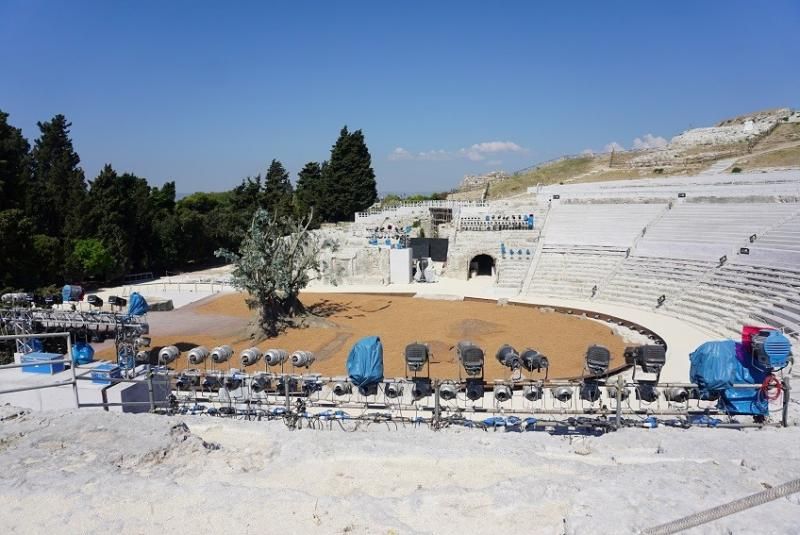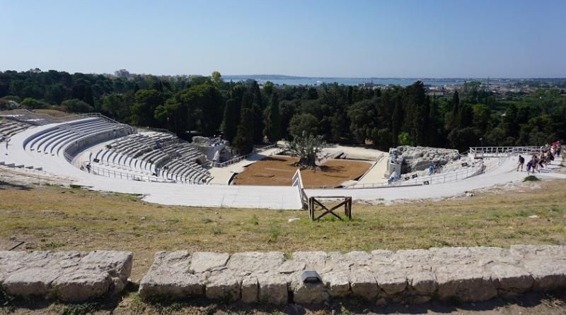 MÖ 5. yüzyılda bir yamaca, lantomia taşından yapılmış muhteşem tiyatro, İtalya, Kuzey Afrika ve Anadolu dâhil olmak üzere bütün Akdeniz havzasını egemenliği altına alan Yunanlardan kalma. (Anadolu’daki Yunan kökenli tiyatrolar gibi.)