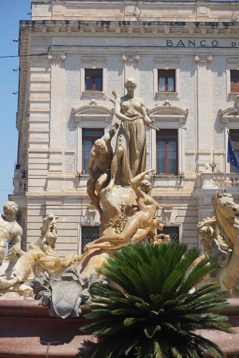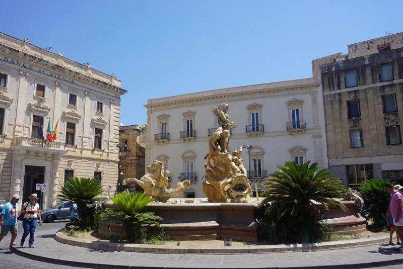 Adını kentte doğmuş, yaşamış bilim adamı Arşimet’den alan “Archimede Meydanı” na (Piazza Archimede) geldiğimizde karşımıza ortasında çok güzel heykeller ve fıskiyeleriyle küçük ama güzel bir çeşme çıkıyor: Fontana di Artemide.