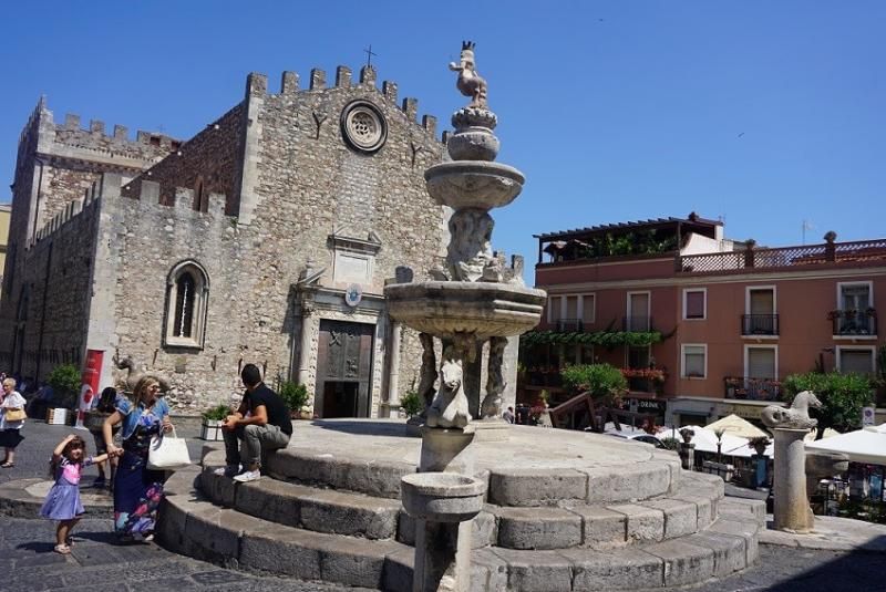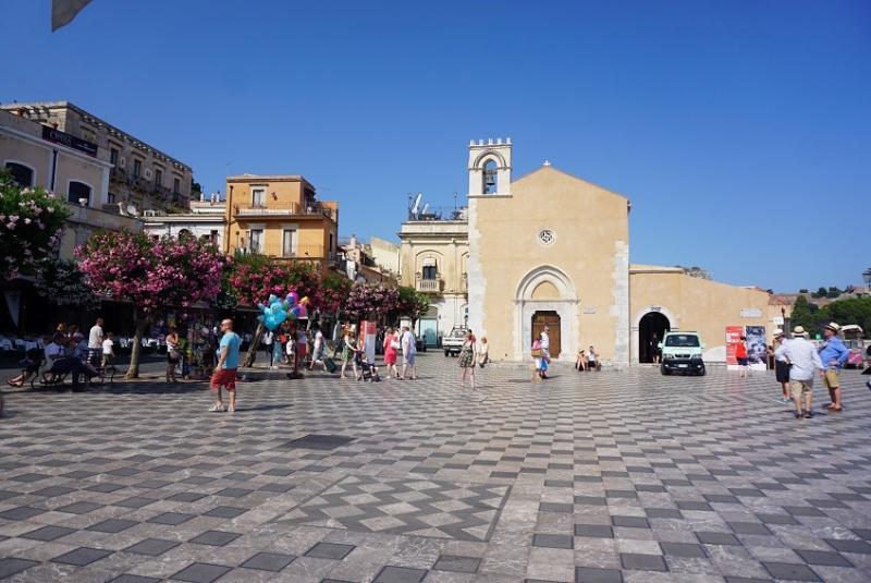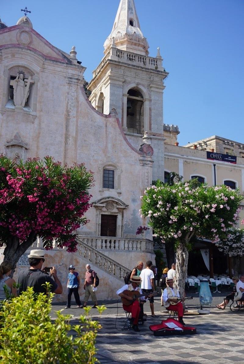 Şimdi sokaklar arasında yürüyerek tarihî eserleri gezelim. 1400’lü yıllardan kalma, Taormina’nın en büyük kilisesi Duomo di Taormina'ya gittiğimizde tesadüfen bir nikaha tanıklık ettik, kapıdaki gelin arabası da görmeye değerdi).