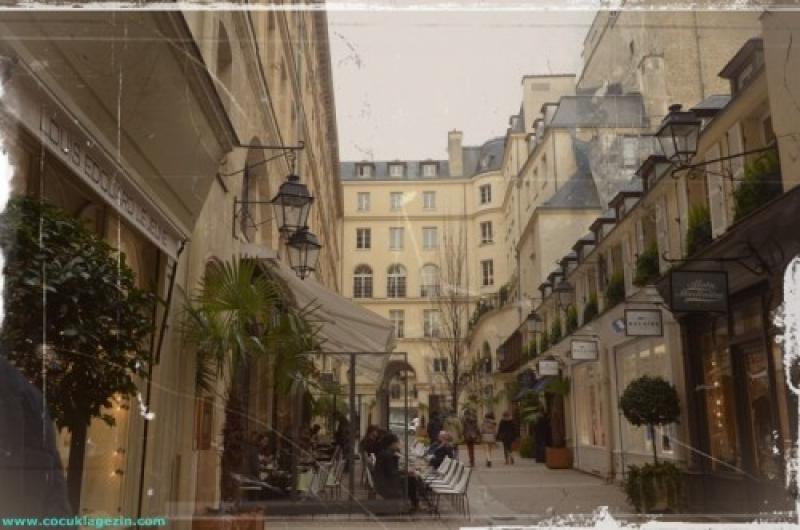 Paris'te bir pasajın içinde yer alan kafe ve mağazalar