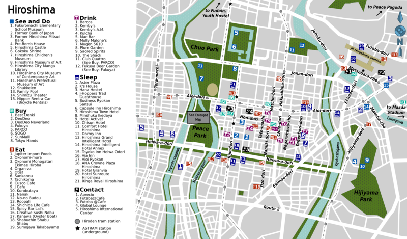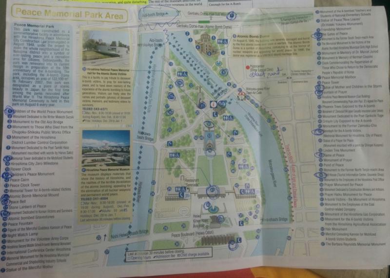 Barış Parkı Atom bombasının hemen patladığı yerin altında bulunan bölgeyi kapsıyor. Toplamda içinde 50'den fazla heykel ve anıt var. Hiroşima'da gezilecek yerler haritada işaretli olanlar ama bunlar dışında zamanınız varsa diğerlerine de gitmeye çalışın.
