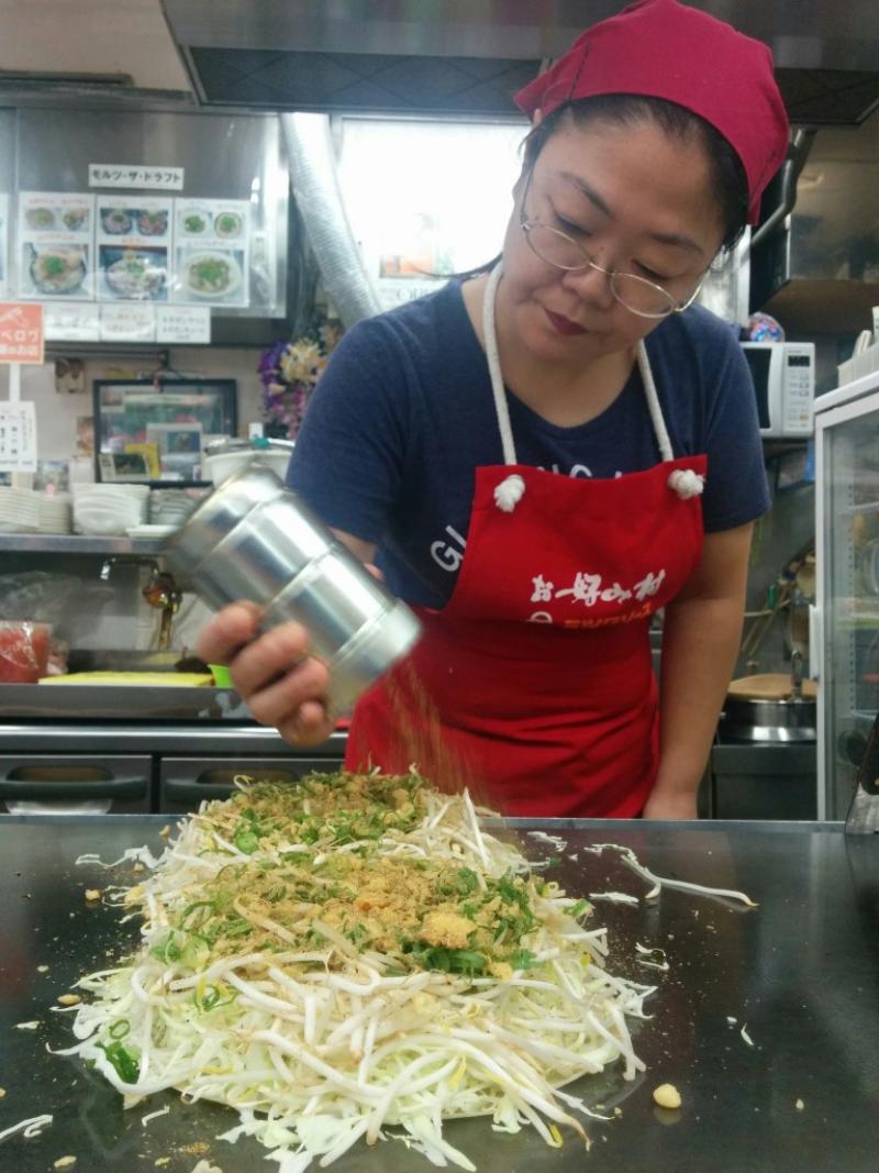 Okonomiyaki’ye Japon pizzası denilebilir ama bence çok daha lezzetli ve doyurucu. Bu teyze gayet lezzetli yapıyor mesela.