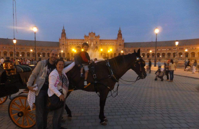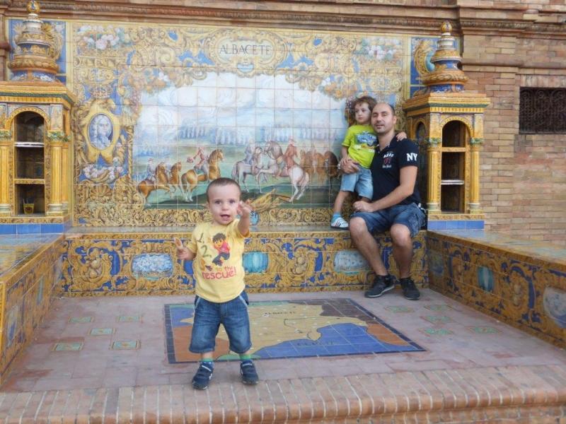 İspanyol meydanı sevilllada en beğendimiz yer oluyor bu nedenle gecesi haricinde gündüzde görelim diye ikinci günümüzde tekrar geliyoruz, etrafta bolca gelin damat var onlarda resim çektirmek için burayı tercih ediyorlar. Meydanın çevresinde İspanya'nın tüm bölge ve kentlerinin çizimlerini içeren çiniler var ve gerçekten görülmeye değer. Birde çocuklar için eşek turu var bizim çocuklar bayıldılar 1 kişi 2 € , resim çektirmek 1 €.