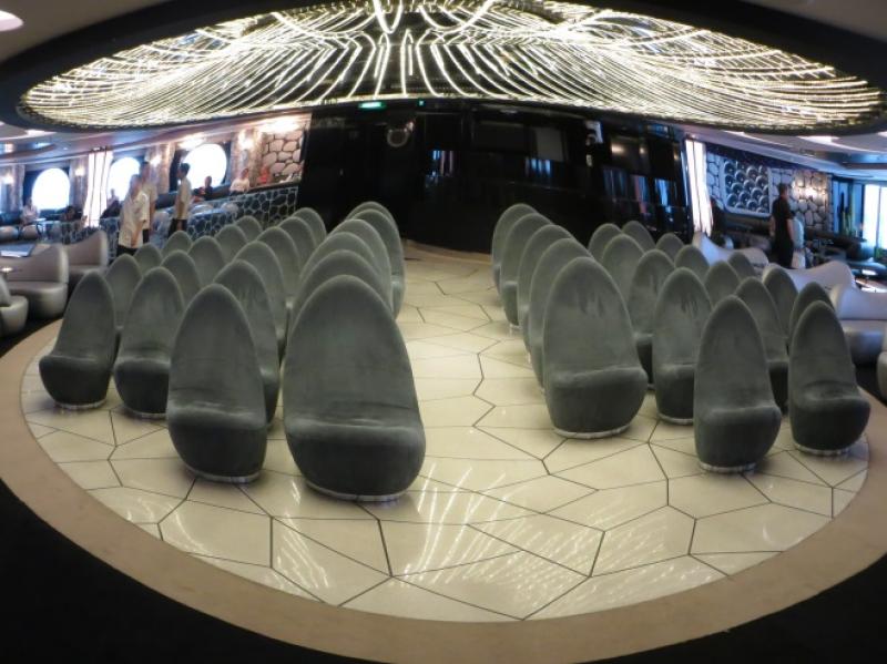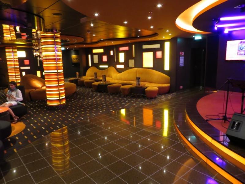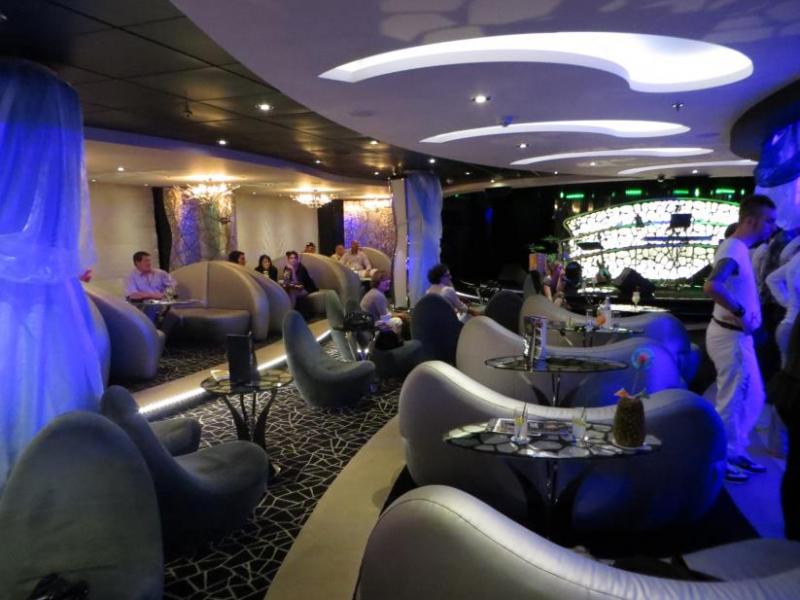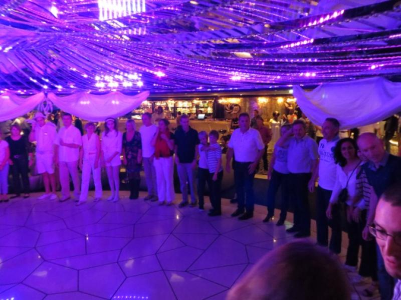 Saat 20.30’da Villa Rosa restoranındaki masamıza geçiyoruz ve zengin menümüzden yemeklerimizi seçiyoruz. Sizlere menüyü her gün sayamam ama bu gece karides yiyeceğimi belirtmek isterim. Yanında deniz mahsulleri salatası ve bir şişe beyaz şarap. Keyif yapmaya geldik ya bu gemiye. Saat 22.30’da ise Black&White salonunda Beyaz Parti var. Resimdeki oturma gruplarının ne kadar modern olduğuna dikkatinizi çekerim. Pist öbür tarafta ve millet coşmuş durumda. Herkes beyaz giymiş ve eğlence ekibiyle birlikte dans ediyoruz.