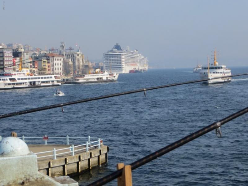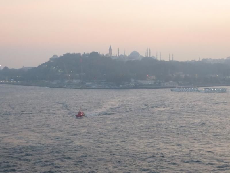 Galata Köprüsü’nde yukarıdaki pozları çektim. Gemimiz uzaktan nasıl görünüyor diye baktım. Balıkçılarla sohbet yaptım. Herkes ah o gemide ben olsaydım diyor. Bir defa daha ne kadar şanslı olduğumu hissettim. Allah’ıma şükrettim. Sonra Eminönü, Mısır Çarşısı, Karaköy, Tünel, Beyoğlu, Her Yer Taksim ve Galata Köprüsü’nden aşağı Tophane’ye indik. Hava güzel olunca bu tur bize yetti ve gemimizin kalkış saati olan 17’den 1 saat önce gemimizde ve özellikle güvertede yerimizi aldık. Hava kararmaya başladığı anda hareket ettik ve gün batımında İstanbul’u ve Boğaz Köprüsü’nü de seyrederek, Marmara Denizi’ne doğru yolumuza koyulduk.