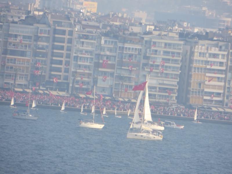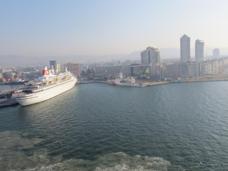 Hazırlıklarımız tamam. Saat 11.00 gibi limana gidiyoruz, pasaport ve gümrük kontrolünden sonra işte gemimizdeyiz. Hemen kabinimizi kontrol ediyoruz ve güverteye çıkıp etrafı kolaçan ediyoruz. Gemi neredeyse boş, çünkü yolcuların büyük bir kısmı İzmir’e indiler. Bir kısmı tur otobüsleri ile sabahın 9’unda Efes - Şirince - Bergama tarih ve kültür gezilerini yapıyorlar. Bir kısmı da Kordon ve Kemeraltı alışveriş ve Türk lokumu, köfte, döner vs. tadım turundalar. Ama bence Kordon’dan geçenler şanslı, çünkü bugün 29 Ekim Cumhuriyet Bayramı dolayısıyla, bayram havası soluyorlar.