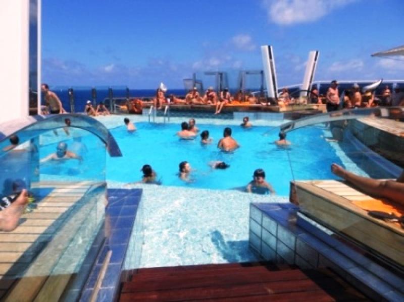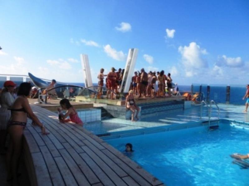 Havuzlarda (gemide girebileceğimiz 6 adet havuz var) eğlenceler devam ederken, güneşe çıkmayanlar veya verandalarda gezinenler için açık pazarlar da açılmış durumda. Parfümlerde indirim varmış! (3 adet 119 €) Marka çantalarda % 50 indirim günü ve kolyelerde de ucuzluk var vs. vs.
