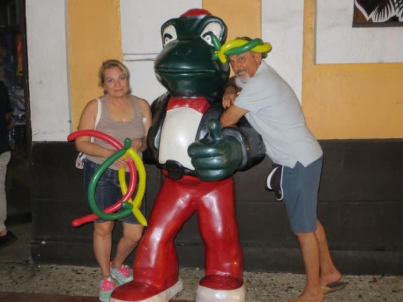 Hava hafiften kararmaya başladı ve bir kahve molası daha verelim diyoruz. Ama hem wifi kullanmak hem de dinlenmek için oturduğumuz kafede, buranın meşhur romlarının tadına bakmadan olmaz diyoruz ve hoop birinci kadeh fondip gitti bile. Burası bize pahalıya patlayabilir. Wifi haberleşmemiz bittikten sonra yolumuza devam ediyoruz ve marketten 1 şişe rom gemide tüketilmek üzere zulalanıyor. Sonrasında deniz kıyısında bir parka oturuyoruz ve kola-romlar içilsin, kadehler boşalsın, kahkahalar San Juan’ı inletsin diyerek kafaları buluyoruz. İşte bir keyifli an, keyifli bir akşam daha sona eriyor. Gemiye dönerken yol üzerinde Karayipler’in meşhur barı Senior Frog'lardan birine uğruyoruz. Biraz dans, biraz balon şapkalar ve şamata. Artık gemimize dönelim mi? ne dersiniz? Yorulduk yahu.
