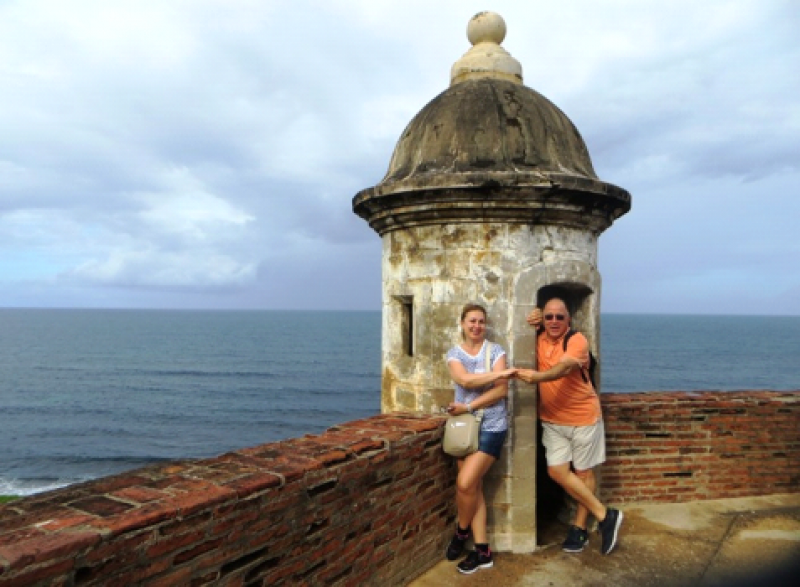Şimdi ilk olarak ücretsiz eski şehir turu yapan turistik trolleylerin ilk durağına doğru yürüyoruz. Bugün bayram olduğundan, şanssızlığımızdan tek bir araç çalışıyor ve dolayısıyla da kuyruk var. Gelen araç da dolu olunca bize tabanvayı kullanmak kalıyor. Yani yürüyerek gezimize başlıyoruz. İlk olarak San Cristobal Kalesi’ne çıkıyoruz. Kapı girişinde nöbet tutan İspanyol askerleri ile sohbet ediyor ve hatıra fotoğrafı çektiriyoruz. Daha sonra da kalenin gözetleme kulelerinde sevgililer bu sevgi pozunu veriyor ve bu el ele pozlarını çekmem konusunda bayağı ısrar ediyorlar. Ne dersiniz bu ikisinin aşkları bu tarihi alanlarda depreşti galiba!