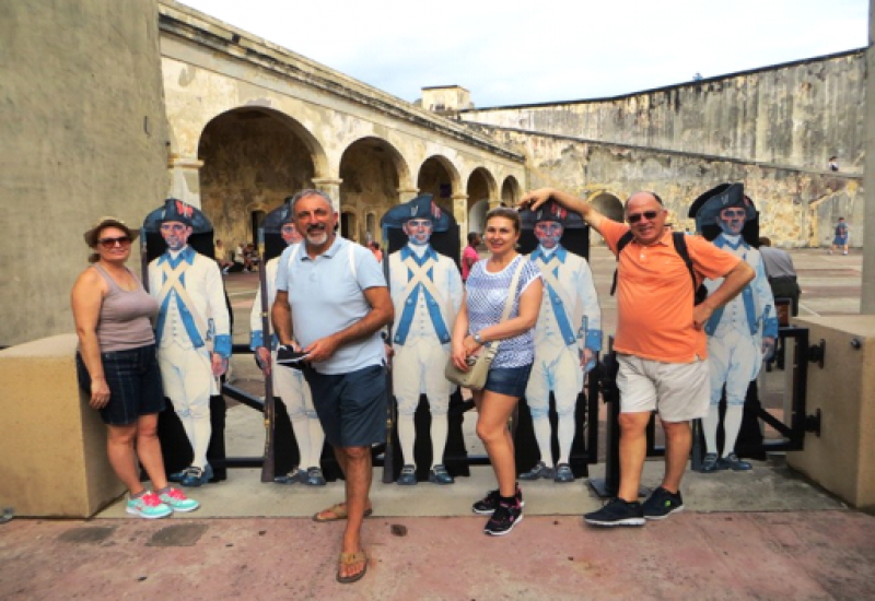 Gemiden çıkınca bizi Kristof Kolomb'un gemisi karşılıyor. Hemen burasının tarihini anlatıyorum bakın dinleyin.1508 yılında Kristof Kolomb tarafından keşfedilen Karayipler’in en büyük adalarından biri olan Porto Riko, Atlantik Okyanusu’ndan gelen sıcak su akıntılarının sayesinde gemilerin Avrupa ve Afrika kıyılarından buralara kolaylıkla ulaşılmasını sağlıyormuş. Bu nedenle Karayipler’in de giriş kapısı olarak adlandırılan Porto Riko, keşfinden itibaren Avrupalıların, bilhassa İspanyol ve İngilizlerin gözlerini diktikleri ve uğruna birçok savaşlar yaptığı bir adadır. 1898 yılında ise en son savaşta Amerikalıların eline geçmiş ve daha sonra da 1983 yılında dünya mirası koruma listesine alınmıştır. İşte şimdi gezeceğimiz San Cristobal ve El Moro kaleleri bu savaşlardaki en önemli savunma kaleleridir. Bu kaleler sayesinde İspanyollar 10 nesil boyunca buralara sahiplenmişler, ticaret yapmışlar ve buraların zenginliklerini kendi ülkelerine taşımışlardır. Şimdi, ABD’nin bir eyaleti olan Porto Rio, kendi iç işlerinde bağımsız, Amerikan kongresinde ise 1 üye ile temsil edilmekte ancak oy kullanma hakkı yoktur. İngilizce ve İspanyolca ana lisanlarıdır ve en çok İspanyolca konuşulur. Bu konuda daha önceki ziyaretime ait yazılarımı ve bilgilere ulaşmak isterseniz işte size Gezimanya sitemizde yayımlanan o yazımın linki: https://gezimanya.com/GeziNotlari/cruise-ile-dunyanin-kesfi-8-bolum-san-juan-puerto-rico-1