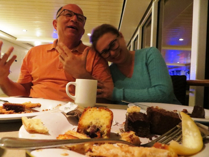 Gemimize döndükten sonra hemen 15. kata yine uğruyoruz. Bu sefer kekler ve pastalar Haluk'tan. Kahveler ise Hacer'den afiyet olsun. Haluk burada Hacer'e şarkı söylüyor. Keyfe bakar mısınız? İşte bu keyfi ancak gemide bulabilirsiniz.