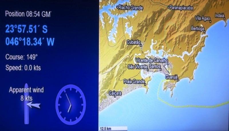 Denizde geçen 22 güzel günlerimizin ardından Transatlantik gemi seyahatimizin son gününde, artık bugün Santos’da gemimizden ayrılıyoruz. Gemimiz MSC Preziosa sabah saat 7.00’de limana yanaşırken şehrin yerleştiği Sao Vincente adasının o kıvrımlı körfezine girip terminalin önüne demirlerken, biz de güverteden Santos’u seyrediyorduk. Odamızı son bir defa toplamaya gittiğimizde TV de güncel bilgiler ve pozisyonumuz da ve yanaştığımız yere bir göz atmayı ihmal etmedim. İşte resmettiğim haritada saat 6.55, 8kn rüzgâr sancaktan esiyor ve enlem, boylam bilgilerimiz. Speed 0 knt. yani yanaşmışız.