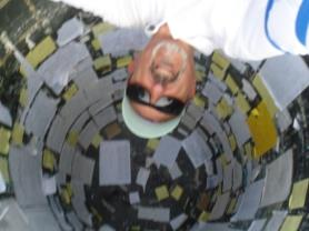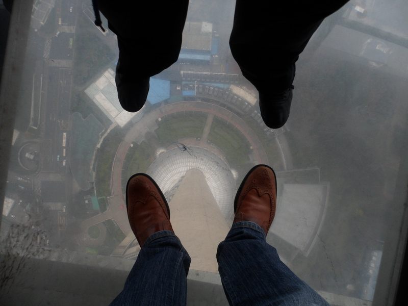 En üst katındaki küreye asansör ile ulaştık. Tabii ki muhteşem bir manzara vardı ama enteresan ve korkutucu olan ,küreyi çevreleyen kenar taban camdı ve üzerine çıkmaya cesaret edenlere güzel bir manzara sunuyordu.