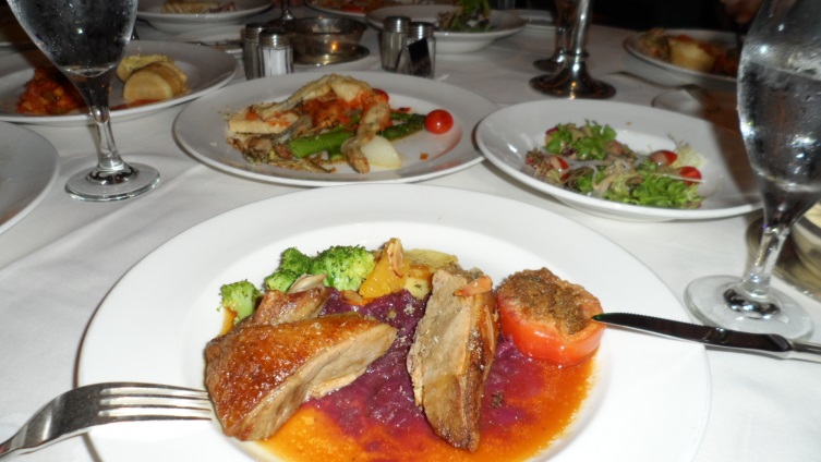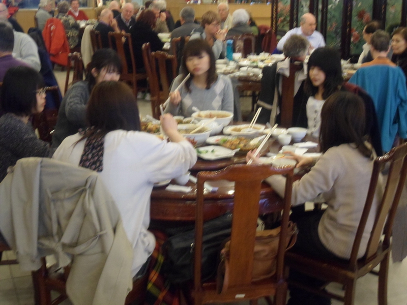 Mekan çok büyüktü ve merdivenlerden masamıza kırmızı halı üzerinde yürüyerek geldik. Siparişlerimizi verdikten sonra hafif atıştırmalıklar eşliğinde biralarımız geldi ve büyük bir masanın ortasındaki dönen tablaya kondu. Sabit tabak ve çatallarımızla, dönen tabladaki yiyecekleri tabağımıza almamız bayağı zordu. Çünkü masada herkes o yuvarlağı kendi önüne döndürüyor ve siz tam alacakken çatalınız boşta kalıyor. Alışık olmayana oyuncak işte buyurun bakalım. Derken siparişlerimiz kişi başı yarım ördek olarak 2 servis arabasında masamızın yanına geldi.