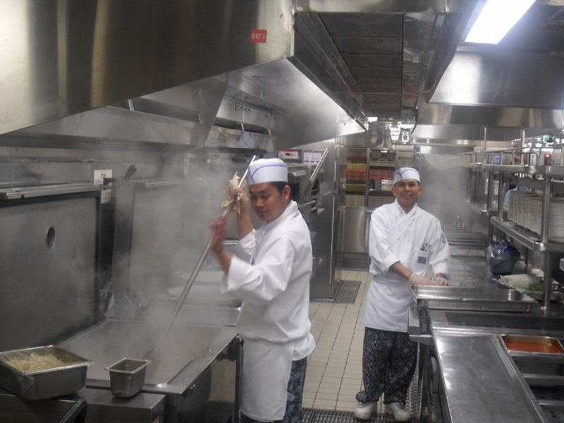 Kahve nasıl olsun, yoook. Siz bu akşam çok yediniz. Açgözlülük yaptınız. Hah işte benim demem de bu. Bu gemilerde kendinizi ve boğazınızı tutmayı da öğreniyorsunuz. Yani nefsinize hakim olmayı. İkinci ve üçüncü günden sonra zaten az az yemekleri tatmaya ve masanın zenginliği ile gözünüzü doyurup normal yemek düzeninize dönüyorsunuz. Siz siz olun yine de bu gemide 18 saat mi desem 24 saat mi desem devamlı yiyecek bir şeyler bulabileceğinizi unutmayın ve midenizde rezerve yer bırakın, her an karşınıza bir yiyecek çıkabilir. Ama bütün bu yediklerinizi eritmek için de spor yapın. Bu arada sizin için geminin mutfağına da girdim. Her daim bir şeyler pişiyor ve ocak boş değil. İşte bizlere bu güzellikleri sunan aşçıbaşımız ve restoran müdürümüz. Sizler için bu pozu verdiler.