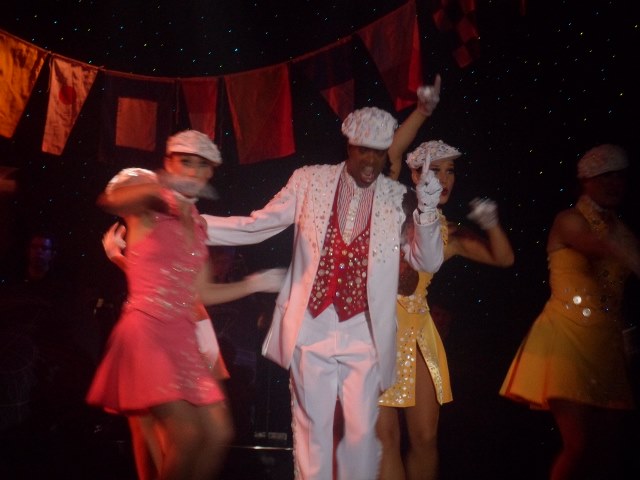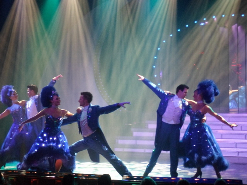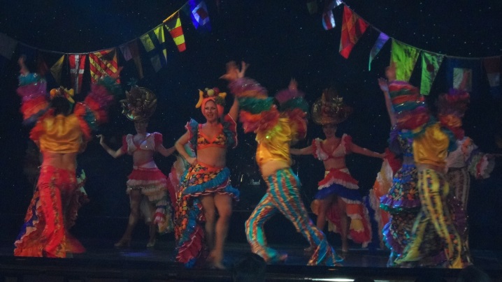 Haydi haydi şov zamanı. Yemekten artık kalkalım ve lobide şöyle bir dolaştıktan sonra tiyatroda yerimizi alalım. Şimdi bu şovlardan isterseniz biraz bahsedeyim sizlere. Ben bu sahnenin arkasını da gezdim. Sanatçılar ve dansçılar tabii ki makyajlarını burada yaptırıyorlar. Kostümlerini burada giyiyorlar. Aksilikleri de burada yaşıyorlar. Yüzlerce elbise ve kostüm, raylı askılarda asılı ve sanatçının veya dansçının o günkü rolüne uygun kıyafet, raylar (lunaparktaki rollerlar gibi) vasıtasıyla hareket ederken, bilgisayarlı düzenekle önünde duruyor ve 2 dakika içersinde 20-30 kişi giyinip sahnede yerini alıyor.