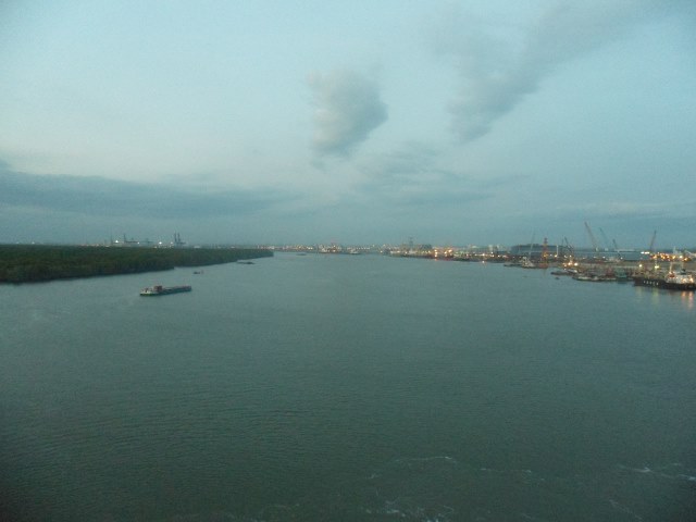 Gemimize saat 17.30 da geliyoruz ve kalkış saatimiz 18.00. Ohh! rahat bir nefes, duş ve ardından yine güverteye çıkıyoruz. Gemilerin hem kalkış hem de yanaşma zamanlarında, her zaman güvertede olun. Çok güzel şehir manzaraları ve doğa harikaları ile karşılaşabilirsiniz. İşte size Mekong nehrinde gemimizin limandan kalkıp geriye dönüp, nehir ağzına doğru seyrinden 2 fotoğraf sunuyorum.