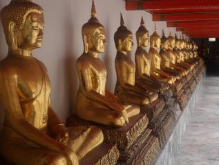 İlk olarak sizlere Bangkok’un bir tapınaklar cenneti olduğunu söylememe gerek yok herhalde. Önce rehberimiz bizi Wat Pho tapınağına götürüyor. Burası uzanan Buda heykelinin bulunduğu tapınak. Hindistan’daki en eski Buda heykelinden sonra, bu Uzanan Buda dünyanın en büyük ve en eski heykeli 43 metre boyunda ve 15 metre yüksekliğinde olan bu yatan Buda heykelinin tamamı altın varak ile kaplı.