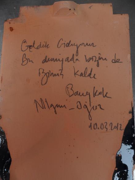 Giriş ücretleri ve çeşitli bağışlar ile buranın devamlı restorasyonu ve bakımı yapılıyormuş. Bizim burada bulunduğumuz anda da çatı kiremitleri aktarılıyordu. İşte elime aldığım yeni bir kiremitin arkasına ismimizi ve bugünün tarihi ile dileğimi yazdım. Bu kiremit şimdi Wat Pho’nun çatısında ve bizim ismimizi taşıyor.