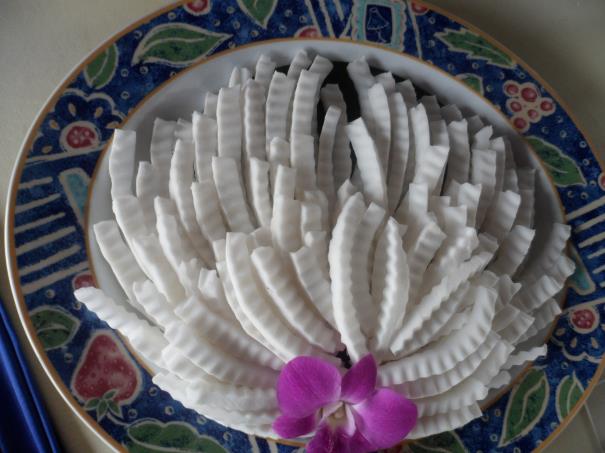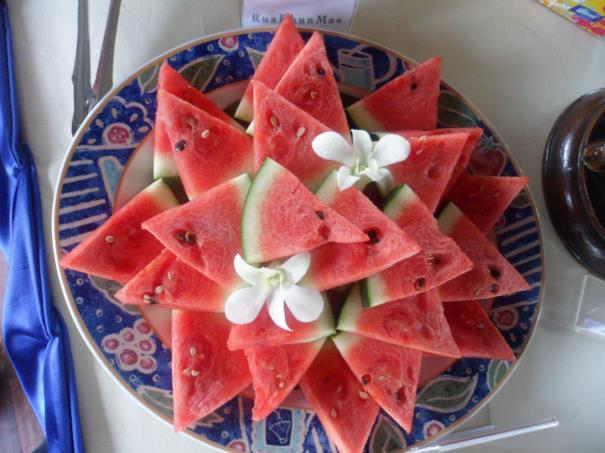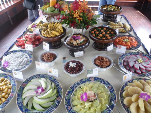 Eveeet artık karnımız acıktı ve midemiz kazınıyor ne yiyeceğiz derken, rehberimizden yine bir sürpriz. Kayığımız büyük bir tekneye yanaştı ve tekneye Türk bayrağı çekilmişti. Güzel bir jest. Tekneye teker teker çıktığımızda, bir de ne görelim. Aman Allahım! dünyanın en güzel meyvelerini öyle bir sunuş ve ikram yaptılar ki. Pes vallahi diyorum. Görmediğim, tadına bakmadığımız bütün meyveler burada. İsimlerini de etiketlemişler. Biz tabii açız, ama mide ferman dinlemiyor. Hemen meyveleri yemeğe başladık. Tabii ki sizlere çektiğim şu resimlerden sonra. Sonrasını göstermek istemiyorum. Hele bizim halimiz çok komikti. Tekne bizi iskelemize götürdüğü sırada birer maymun gibi bir kenara çekilmiş ve göbeklerimizi sıvazlamaya başlamıştık bile. İşte size mango, jack fruit, ejder meyvesi, greyfurt, karpuz, Hindistan cevizi, papaya, muz, ananas ve ballı kavrulmuş çeşitli kuru fıstık ve cevizler.