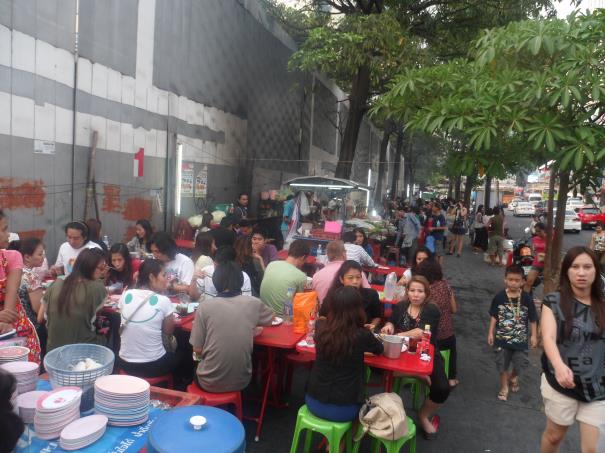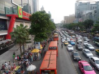 Şimdi alışveriş ve masaj zamanı. Meşhur Rama 4 Bulvarına gidiyoruz. Yolumuzun üzerinde çeşitli masaj salonları var ve kafilemizde masaj yaptırmak isteyenleri 1,5 saat sonra aynı yerden almak üzere bırakıyoruz. Otobüsümüz bizi de biraz ileride merkezi bir yerde indiriyor. Dev alışveriş mağazalarının olduğu yerde önce biraz soluklanıyoruz. İhtiyaç molası. Sonra ana cadde üzerinde kurulu olan işporta pazarına dalıyoruz. Tabii ki benim ekip yine peşimde hızlı bir turdayız. Hanımlar tabii ki bir şeyler almadan olur mu? Cadde kenarları yine seyyar lokantalarla dolu. Herkes boğaz derdinde. Yoldaki trafik derseniz. Sormayın görün derim.