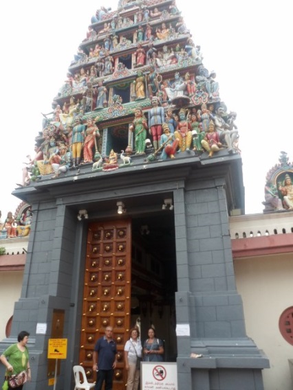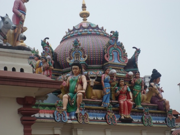 Şimdi isterseniz sizlere biraz Singapur hakkında bilgi aktarayım. 1819 yılında Thomas Raffles adalara yerleşilmesinden sonra burada İngiliz koloni devletinin ilk adımlarını atmış. İngiliz kolonisi olarak 1827 yılında şimdi sanat merkezi olan ilk parlamento binasını inşa ettirmiş ve bugünkü modern yeni parlamento binasına 1999 yılında taşınılmış. Bugün 5 milyon nüfuslu Güneydoğu Asya’nın tek ada şehir devleti. Para birimi Singapur doları(SGD) ve 1$ = 1.27 SGD. Singapur halkının %75 ini Çinliler, %14 ünü Malaylar ve %9 unu da Hintliler oluşturmaktadır. Singapur’un %50 si büyük ana parklardan oluştuğu için her taraf yeşil. 4 adet de tabiat koruma havzası var. Tabii ki programımızda bu parklardan bence en güzel olanı National Orchid Garden’ı ziyaret edeceğiz, ama yarın. Bugün küçük Hindistan ve yanındaki Çin mahallesine doğru gidiyoruz. Yürüyerek yarım saatte Çin mahallesine geldik. Önümüze ilk olarak Sri Mariamman Hindu Tapınağı çıktı. Hemen içerisine bir göz atıyoruz. Resimlerde de göreceksiniz, rengarenk ve her tarafı küçük heykelciklerle donatılmış. İşte size kapısının önünde bir poz ve binanın kubbelerinden birinden küçük heykelcik resimleri.