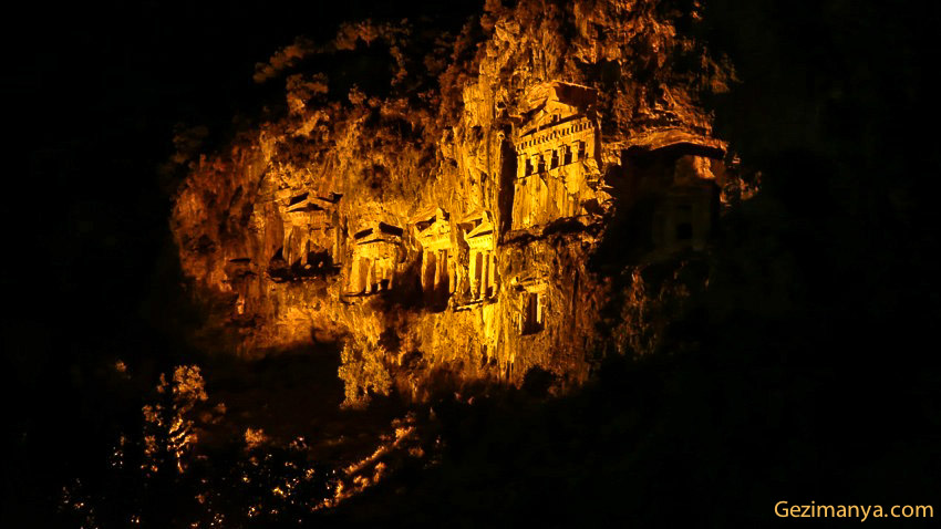 Geceleri Dalyan öyle çok hareketli bir yer değil. Zaten insanlar özelikle yabancılar buraya dinlenmeye ve doğayı dinlemeye geliyorlar genelde. Fakat akşamınızı bir restoranda kanala bakıp testi kebabı yiyerek yada bir kafeye oturarak geçirebilirsiniz. Ayrıca gece ışıklandırılmış olan Kaya Mezarları’nı izlemeden Dalyan’ı gece görmüş sayılmazsınız. Bizde buralarda birşeyler yiyip, birkaç parça da hediyelik eşya alıp geri döndük.