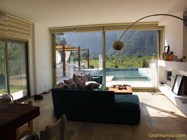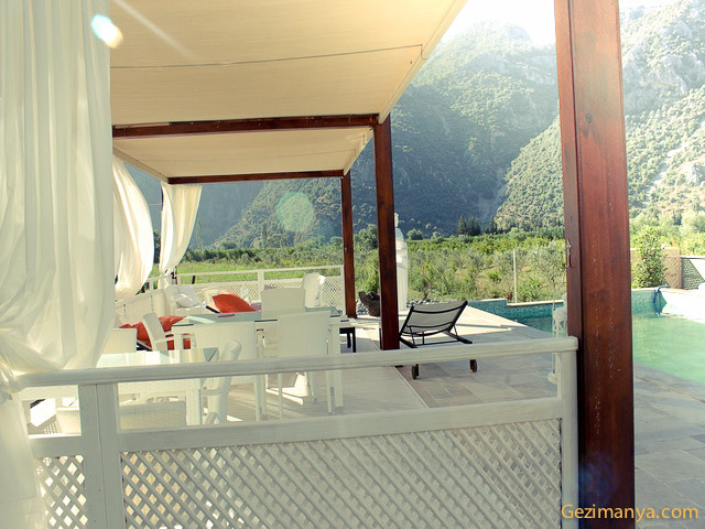 Kalacağımız yere varıyoruz en sonunda. Light of Apollon adında muhteşem bir villa. Kapıya geldiğimizde, otobüs yolculuğunun da etkisiyle, o kadar yorulmuştuk ki aklımda kalan tek şey kuş sesleri, ağaç hışırdaması ve yere düşen olgun dutların çarpma anında çıkarttıkları seslerdi. İçeri girdiğimizde ise karşımızda dağları ve nar tarlalarını görünce epey şaşırıyoruz. Doğayı bekliyorduk, onun için geldik buraya ama bu kadar ayağımıza gelmiş bir doğa beklemiyorduk. Burası gerçekten herşeyiyle lüks ve rahatlık için tasarlanmış bir villa. Havuzu, mimarisi, rahatlığı, engelliler için uygun odası, jakuzisi, yapay bir göl ve kumsalıyla sadece tatil yapmak için değil yaşamak içinde gerçekten uygun bir nokta. Bunların yanında beni etkileyen bir diğer şey de evin sahibi Murat Bey’in buraya kitaplarını ve şaraplarını koymuş olmasıydı. Kaliteli bir yer arıyorsanız Apollon Villası’nı öneriyorum. Neden Apollon’dan bu kadar bahsettiğime gelince; Dalyan villa turizminin merkezi de ondan. Güzeliği de buradan geliyor. Binalar, çirkin, kalabalık büyük oteller yok. Bahçeli, çiçekli villalar var. Biz bahar döneminde gittiğimizden heryer rengarenk çiçeklerle kaplıydı bir de yeşili görünce, onu ne kadar özlediğimizi de farketmiş olduk.