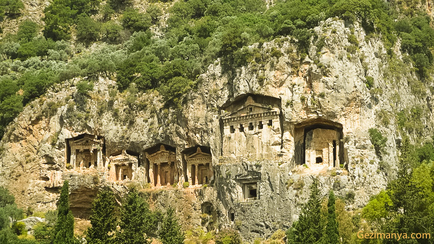 Bizim tuttuğumuz tekne Gökhan Kaptan’a aitti. Kendisi bizi içecek temin etmemiz konusunda uyardı. Biz de nevalemizi sağlamlaştırıp yola çıktık. İlk olarak Kaya Mezarlarına gittik. Kaya Mezarları diğer adıyla Kral Mezarları. Gerçekten akılda kalıcı bir yer, insan şaşırmadan edemiyor. Oyulmuş desenler, sütunlar aklımızı alıyor. Bu insanlar bu kadar yükseğe, dağın içine bu şaheserleri nasıl yapmışlar diye düşünmeden edemiyoruz. Ben yukarı çıkamadım ufacık ve çok çetrefilli bir patika var. Herkesin harcı değil hele ki yükseklik korkusu olanların hiç değil. Ayrıca Kaya Mezarları’nın eteklerinde yabancılar mezarlığı bulunuyor. Tahminimizce Dalyan’a gelip yerleşen yabancı insanlar öldüklerinde ülkelerine götürülmek yerine burada gömülüyorlar. Bu da çok garibime gitti. Üstelik tarihler oldukça güncel.