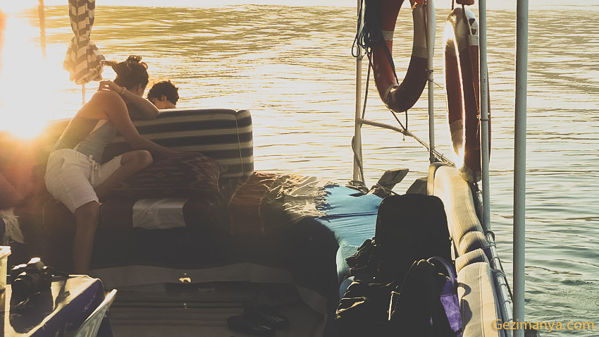 Buradan ayrıldıktan sonra gölün açıklarında demir attık ve mangaldaki balıklardan dumanlar yükselmeye başladı. Rakılar, şaraplar da sofraya gelince ortam iyice ‘değmeyin keyfime’ kıvamına geldi. Göl suyuna girenler çok memnunlar, ben girmedim ama insanlar sıra sıra atlayıp durgun suyun tadını çıkardılar. Tuzlu olmadığı için fazla enerji harcatsa bile ben girmediğime hala pişmanım. Göl keyfinden sonra balıklarda olunca masa muhabbeti iyice koyulaştı. Açıkçası ben zaman nasıl geçti hiç anlamadım. Ama mehtapta sazlıklar arasında giderken hissettiğim o güzel duygu gerçekten hala içimi ısıtıyor.
