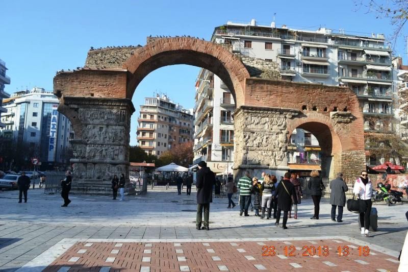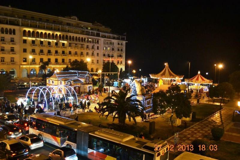 Otelimiz şehrin tam merkezinde, sahile yakın, her iki yanında çok şık binalar bulunan büyük, ferah bir meydana bakıyor, burası Aristoteles Meydanı ve gerçekten çok güzel bir mimari yapıya sahip. Hemen tüm odalar ve terastaki restoran müthiş deniz manzaralı (Electra Palas). Otel çevresi de alışveriş yapmak isteyenler için cennet, İstanbul Bağdat Caddesi’ni andıran Tsimiski Caddesi’ndeki sağlı sollu mağazaların vitrinleri Noel ve Yılbaşı nedeniyle ışıl ışıl ve otelimize çok yakın. Yunanistan'ın fırınları ünlüdür, duymuşsunuzdur, pasta, kurabiye (özellikle Kavala kurabiyesi), kıtır, peksimet, gerçekten de lezzetlidir. Otelimizin tam karşımızda ve girişindendeki pastaneden gelen mis gibi kokular kışkırtıcı… Biz hanımlar için bir o kadar da tehlikeli : )Hemen önümüzdeki meydana ise panayır kurulmuş, tam bir renk cümbüşü, insanlar coşkulu, neşeli.