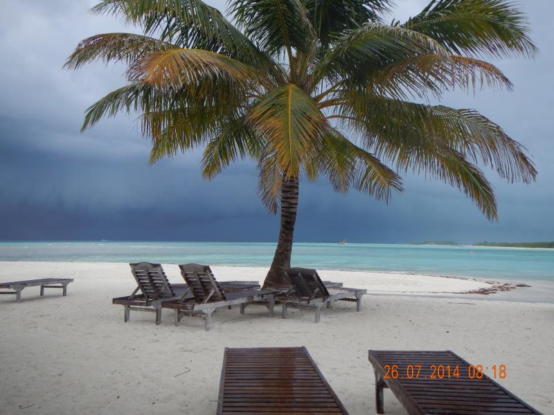 Ertesi gün çok bulutlu bir hava ile uyandık. Uzaklara bakınca kapkara yağmur bulutlarını görebiliyorduk. Yağacak yağmayacak diye konuşurken birkaç saat sonra okyanus yağmuruyla denizde yüzerken tanıştık. Maldivlerde yaz ve kış birbirine karışmış zaten. Kış ayı da olsa sıcaklık ve nem değişmiyor. Kısa bir pantolon ve tişörtle yaz-kış yaşayabilirsiniz. Mont ve kaban satılmayan ülkelerden birisi diye esprisini de yaptık.