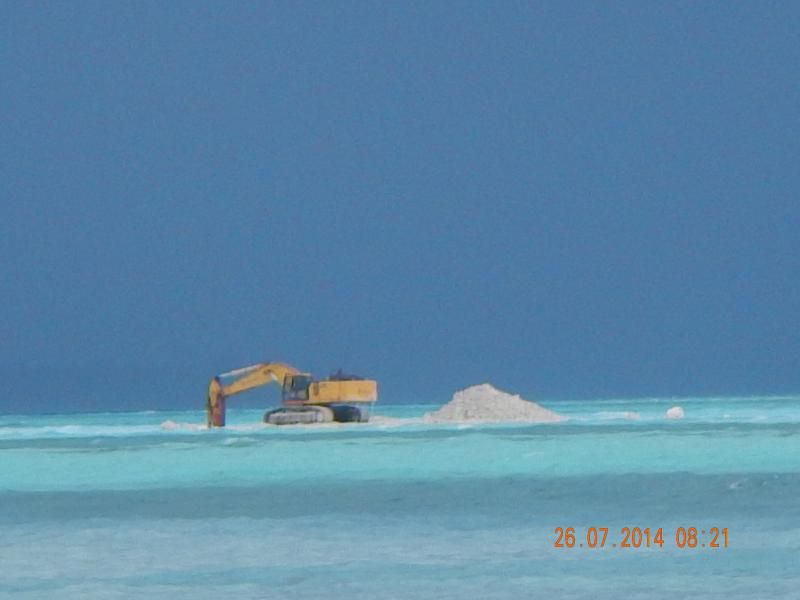 Adanın etrafını keşfetmemiz 20 dakikamızı aldı. Yakınımızdaki adada kepçeler çalışıyordu. Şaşırmayın, bildiğimiz büyük kepçeler denizden o beyaz kumları çıkartıp bir tür karadan denize doğru kumdan iskele yapıyordu. Dikkatimi çeken adanın iç taraflarında da zeminin üstüne denizden çıkan beyaz kumun döşenmiş olması. Çünkü adanın doğal zemin yapısı yürümeye uygun değil. Ama öyle güzel düzlemişler ve beyaz kumu üstüne sermişler ki sanırsınız ki ada bu beyaz kumdan yapılmış. Kumlar da üzerine basınca ayağınız gömülmüyor. Bahsettiğim o üzerinde insan yaşamayan adalar da turizm için hazırlanıyor anlayacağınız.