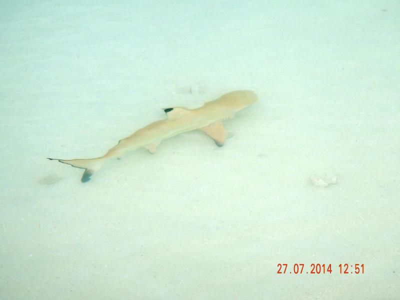 Genelde sırt yüzgeci siyah olan yavru köpekbalıklarının adamızın etrafında hem de sığ sularda yüzdüğünü öğreniyoruz. Büyük olanların kıyıdan daha uzakta olduğunu ve bugüne kadar herhangi bir saldırı ve a yaralanma vakasının olmadığını da öğrenmiş oluyoruz. Yemekten sonra köpekbalıkları bize biraz hazımsızlık yapıyor tabii ki : ) Sonra fotoğraflardan da göreceğiniz gibi biz de alıştık onlara. Artık daha iyi fotoğraf çekelim diye biz onların peşinde koşarken, onlar fazla yaklaşmamıza izin vermeden kaçıyorlardı. Köpekbalıklarıyla yüzeceğimize rüyamda görsem inanmazdım, ama bu rüyam da gerçek oldu : )