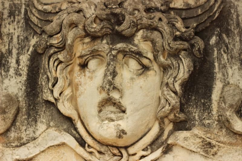 Türkiye’yi tanıtan kartpostallardan mutlaka hatırlarsınız, çatlamış insan suratı figürünü… İşte bu ünlü yüz, biliciliğin sembolü Medusa’nın ta kendisidir. Tapınağa ilk girişte tüm ihtişamıyla Medusa sizi karşılar. Yunan Mitolojisi’ne göre; gözlerine bakanı taşa çevirdiğine inanılan, yılan saçlı, dişi canavar Medusa çok güzel bir kadınmış ve bütün kadınlar Medusa'yı kıskanırmış. Bu güzel Medusa kendisini tanrılara adamış ve iki kız kardeşi ile birlikte baş Tanrı Zeus'un en sevdiği kızı “Zekâ Tanrıçası Athena”ya ait bir tapınakta yaşamaya başlamış. Medusa’nın cazibesine dayanamayan, Poseidon (denizlerin büyük tanrısı) bir gün gizlice sevgilisi Athena'nın tapınağında, güzeller güzeli Medusa'ya zorla sahip olmuş. Bu olayı öğrenen Athena, güçlü Poseidon'un bu yaptığı karşısında kendisini aşağılanmış hissetmiş. Öyle hiddetlenmiş ki Medusa'yı ve kız kardeşlerini birer ifrite çevirmiş. Medusa’nın o güzelim saçlarının her bir teli, bir yılana dönüşmüş. Bununla da yatışmayan Athena'nın siniri bu çirkin halinde bile hala Medusa'ya bakmaya çalışan herkesin bakışlarını taşa çevirmesini sağlamış. Athena bu cezayla da yetinmemiş ve Medusa'nın kafasını kesmeye karar vermiş. Perseus, üvey kız kardeşi Athena’nın bu isteğini hemen yerine getirerek ışıltılar saçıp insanların gözlerini kamaştıran keskin kılıcını savurduğu gibi zavallı Medusa'nın yılan saçlı kafasını bedeninden ayırıvermiş. Athena'nın bilmediği bir şey varmış. Güzel Medusa, Poseidon'un kendisine zorla sahip olduğu gece denizlerin kudretli tanrısından hamile kalmış. Perseus'un gözleri kamaştıran kılıcı Medusa'nın kafasını bedeninden ayırdığı anda, Poseidon'un Medusa'nın rahmine bıraktığı çocukları Pegasus ve Chrysar; Medusa'nın cansız bedeninden dışarı çıkıvermişler.