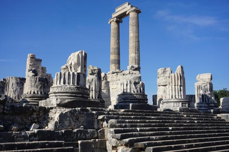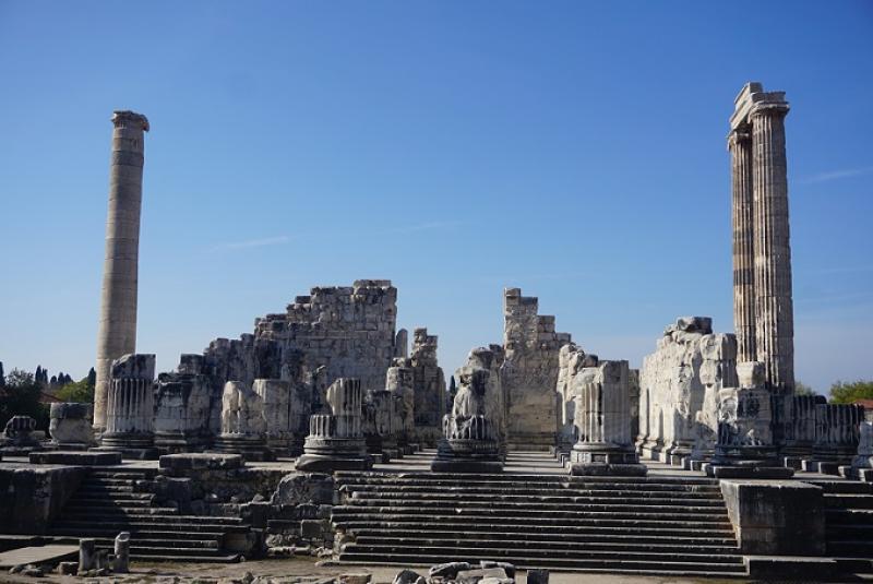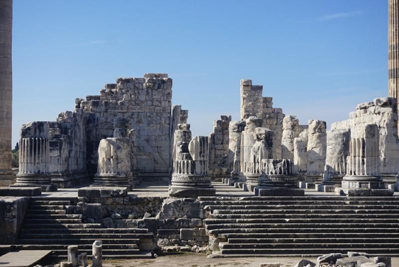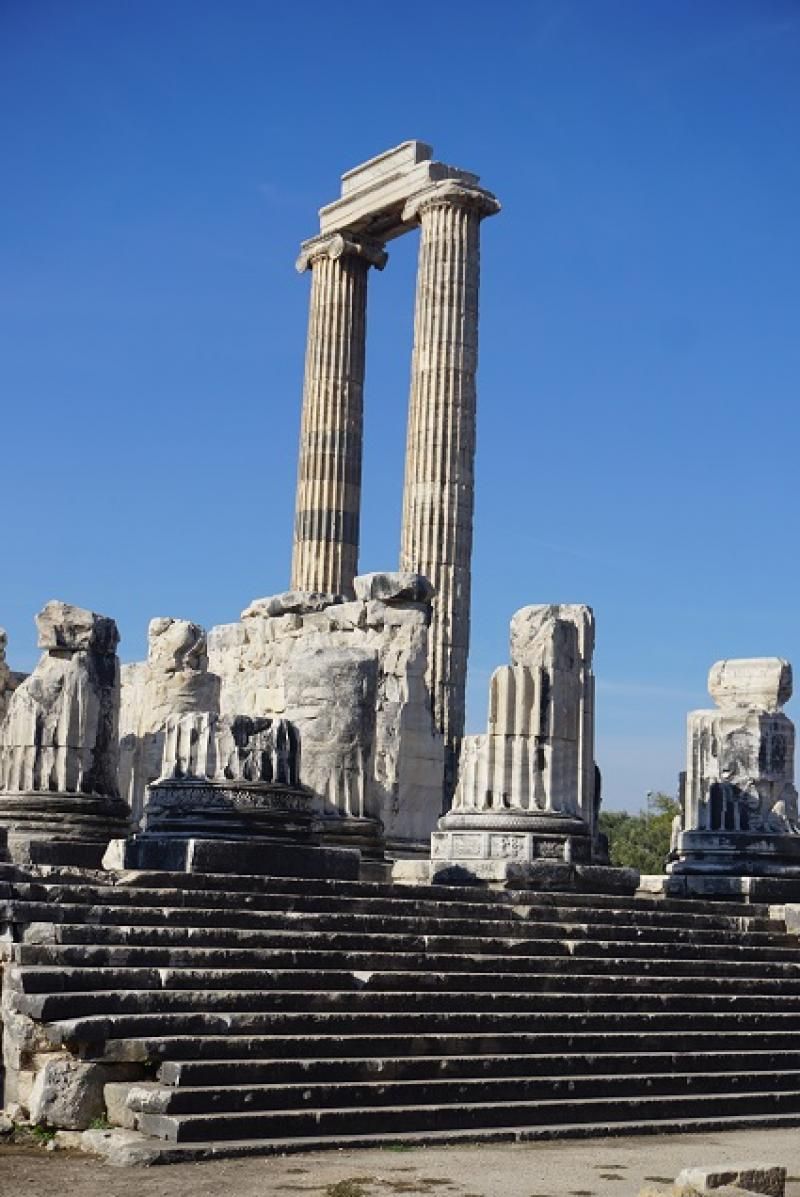 Zeus ve Leto'nun oğlu, Artemis'in ikiz kardeşi, mitolojide müziğin, sanatların, güneşin, ateşin ve şiirin Kehanet TanrısıApollon'a adanan antik Yunan tapınağı. Batı Anadolu kıyılarının en etkileyici anıtı yaklaşık 2600 yıl önce inşa edilmiş ancak 100 yıllık inşa dönemine rağmen tamamlanamamış. 120 metre uzunluğu, 25 metre yüksekliği ile Efes Artemis Tapınağı ve Sisam Adası'ndaki Heraion Tapınağı'ndan sonra geç Antik dönemin üçüncü büyük tapınağı. Gördüğümüz kolon sayıları, duvar yükseklikleri, sütun, kaide ve başlıkları bunun kanıtı.