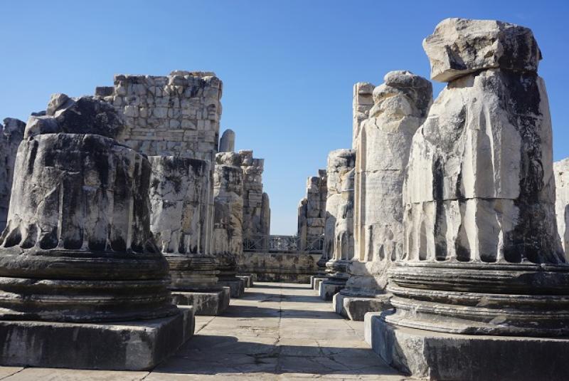 Zamanının en önemli bilicilik ve kehanet merkezi olmuş bu kent. İlk yerleşim izleri MÖ 8000 - Neolitik Devre uzanan ve “Karia” bölgesinin sınırları içinde yer alan dünyaca ünlü bir antik kent. Buraya doğru ilerlerken tapınağın muhteşem sütunları görüntümüze giriyor. Yıllar önce geldiğim tapınağın sütunların yüksekliklerinin, tonlarca ağırlıktaki yekpare mermer blokların ne kadar görkemli olduğunu unutmuşum.