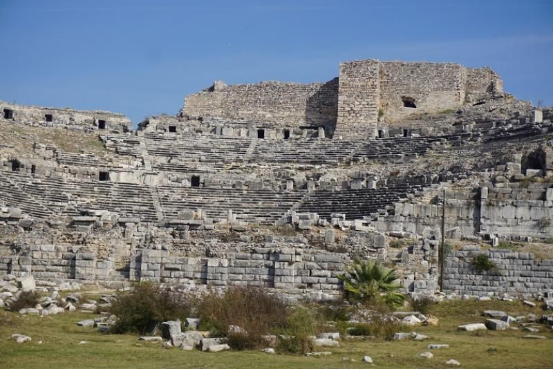 Milet Antik Kenti, Afrodisyas gibi çok büyük bir alana yayılmış, eserlerin hepsini görmek isterseniz bu kente biraz zaman ayırmalısınız. Arabayı park ettiğimiz alanın hemen karşısında yükselen, 19 bin kişi kapasiteli muazzam tiyatro Yunan-Roma tipinin en güzel örneklerinden.