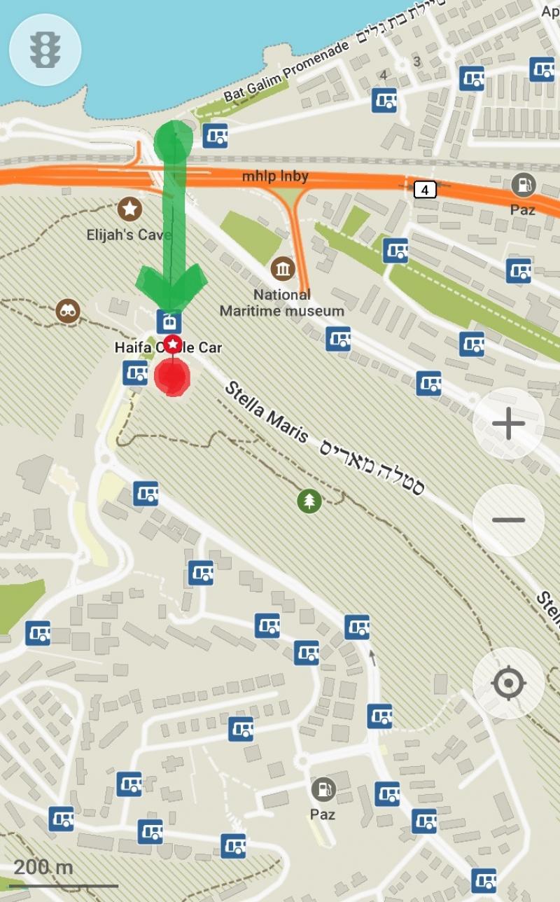 HaHagana / Yo'av durağında inerek kısa bir yürüyüşün ardından teleferiğe (Yeşil ile gösterdiğim yer) ulaşabilirsiniz. Teleferik sizi Stella Maris Manastırı’nın (Kırmızı ile işaretlediğim yer) tam karşısında indirecektir.