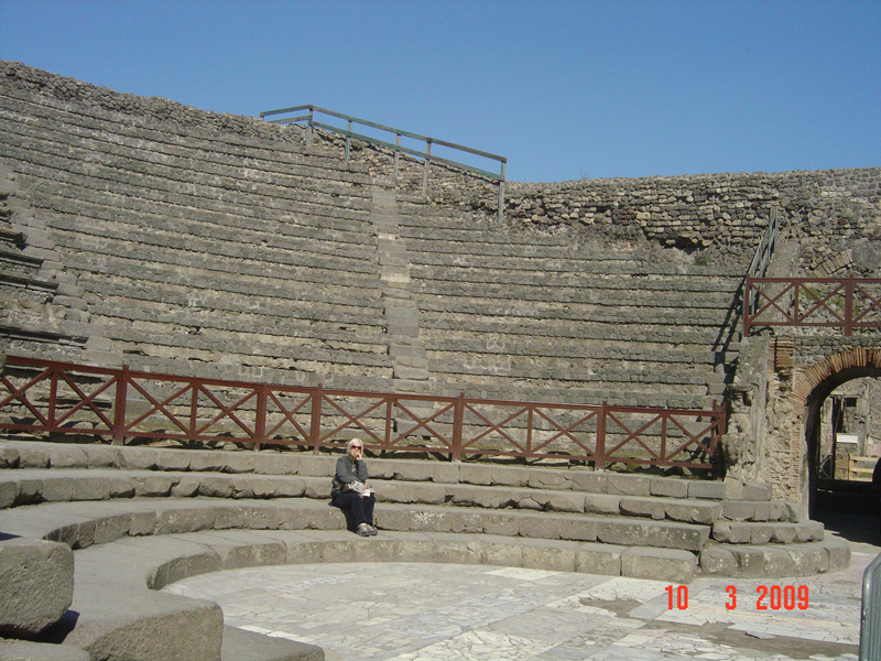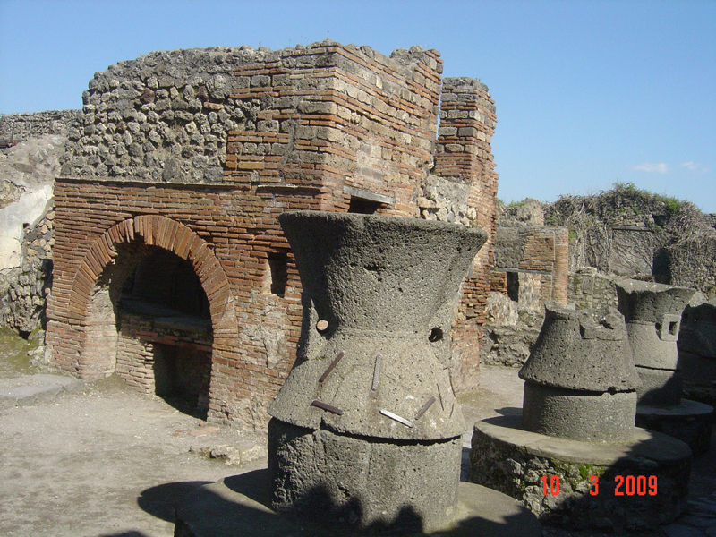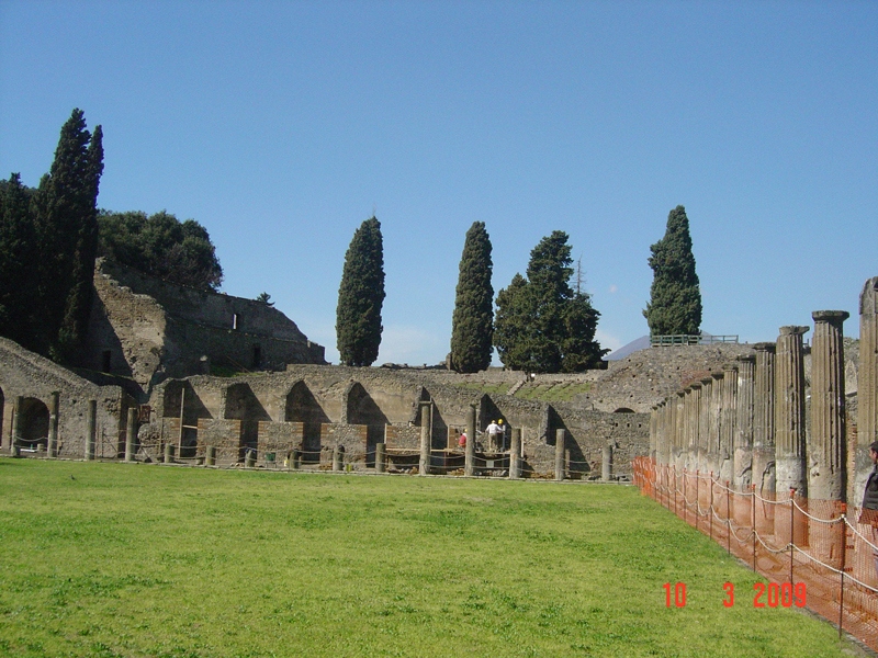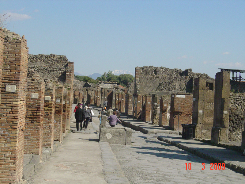 Zamanında Pompei şehri büyük duvarlarla çevriliymiş ve 8 kapısı varmış. Biz de bu kapıların birinden giriyoruz. Kapının iki bölümü var, sağ taraftan araçlar, hayvanlar, sol kapıdan insanlar giriyormuş. Kapıdan geçerek ilerliyor ve şehrin merkezi olan Forum meydanına geliyoruz. Şehrin en önemli binaları buranın etrafında dizili durumda. İki tiyatro binası, tapınaklar, gladyatör alanları, bankalar ve dükkânlar. Binalar 2 katlı, alt kat dükkan ve üst kat konut olarak kullanılıyormuş. Buradaki halkın %60’ı asil, %40’ı köle imiş.
