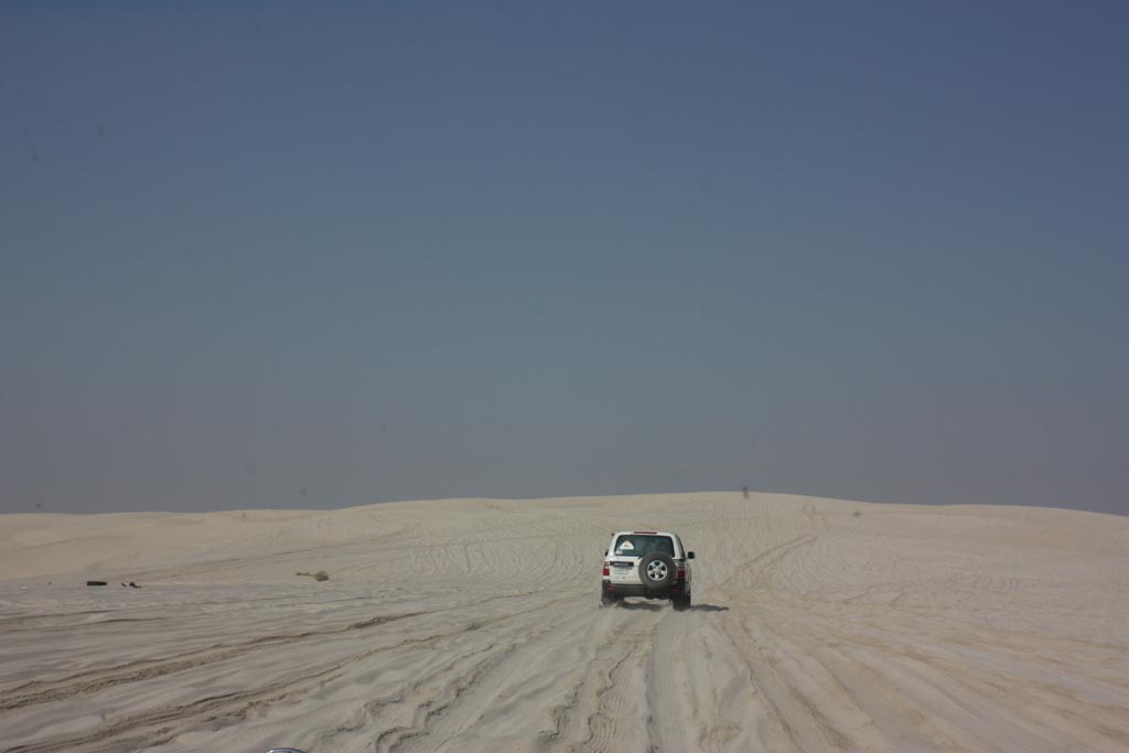 Tüm günlük çöl safarisi için 3 saatlik uykunun ardından su şişelerimiz yanımızda kapının önünde hazırız. Bizi alacak olan Land Cruiser ve Şöforümüz Muhammed geliyor. Adam gerçekten çok cool’du biraz da çılgın. Yaklaşık 5 dakika gittikten sonra bir benzinlikte durduk ve oradan 2 tane Filipinli arkadaş bindi. 2 jeep olarak yola çıkıyoruz. Diğer jeepte de bizim araçtaki Filipinlilerin 4 arkadaşı var. Hepsi de Doha’da aynı firmada çalışıyorlar.