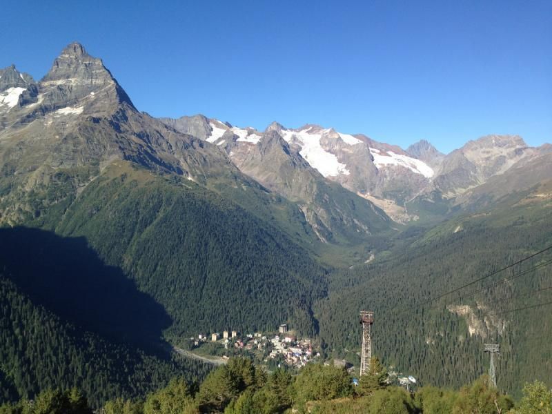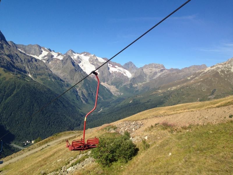 Buradan sonra bu kez de telesiyejlere binerek 2. durağa doğru gidiyoruz. Telesiyej’de 2 kişilik sandalyeler var. Ama bizim Uludağ’da, Palandöken’de, Kartalkaya’da alışkın olduğumuz modernlikten biraz uzaklar. İkinci duraktan da harika manzaralar var. Sıra geldi 3. Durağa. Buraya da telesiyej ile çıktık yine. Önümüzde Elbruz’un zirvesi, arkamızda tepeden baktığımız Dombay’ın merkezi.