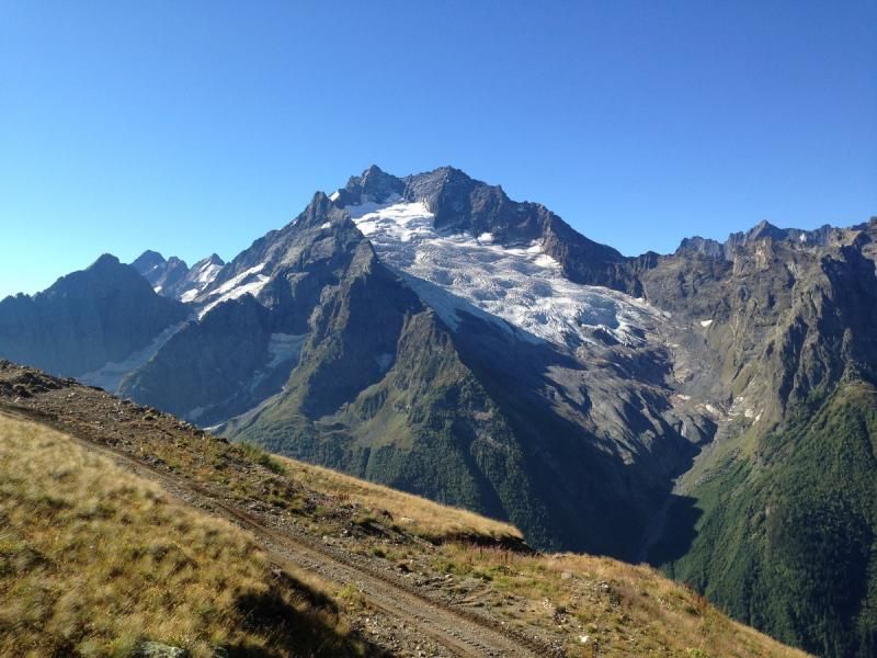 Batı Kafkasya’nın en geniş buzullarından biri olan Alibek buzulu 4.5 kilometre uzunluğunda. Dombay’ın merkezine yaklaşık 9 kilometre mesafede yer alan Alibek buzulu, Alibek Vadisi’nin de hemen yukarısında. Aynı Alaska’da gördüğüm buzulların yanında yer alan şelaleler gibi burada da Alibek Buzulu yanında yine kendisi ile aynı adı taşıyan Alibek Şelalesi yer alıyor.