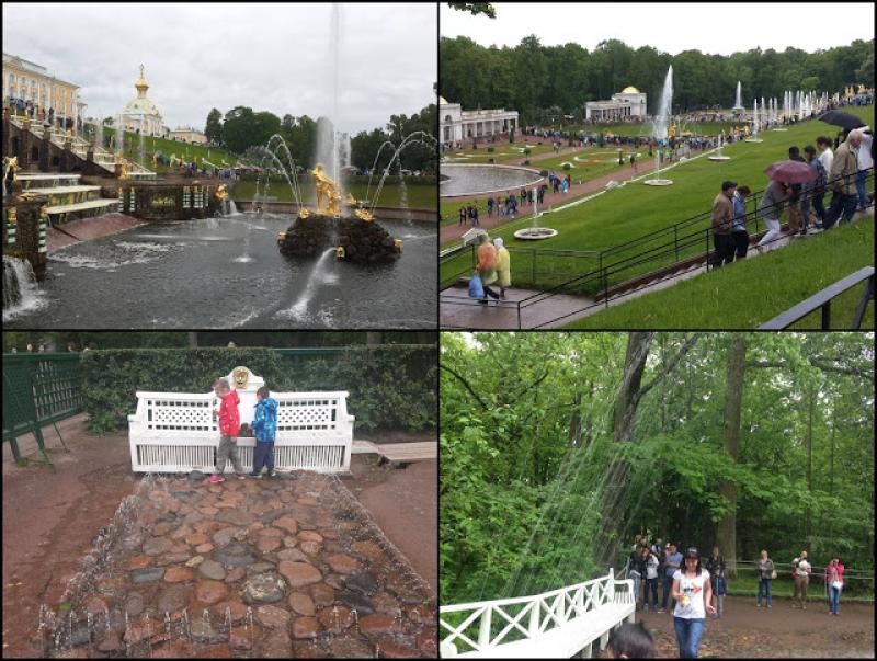3- Girişte önünüz sarayı görecek şekilde durup sol kol tarafında bulunan petronun şakacı su fıskiyeleri. Bu fıskiyeler petro tarafından tasarlanmış misafirleri buralardan geçerken sular otomatik olarak açılırmış ve misafirler ıslanırmış. Çok şakacıymış anlayacağınız. Tabi şu an fıskiyeler fotosellerle çalışıyor. Bizde adeti yerine getirmek üzere şemsiyelerimiz açıp fıskiyelerin altına girdik Deli Petro garip bir adammış misafirlerine yemek verirken içine demir bilyeler atar milletin dişi kırıldığında onların dişini çekermiş. Gerçi ruslar Great Peter yani Büyük Petro diyorlar ama büyük mü yoksa delimi biz tam anlayamadık.