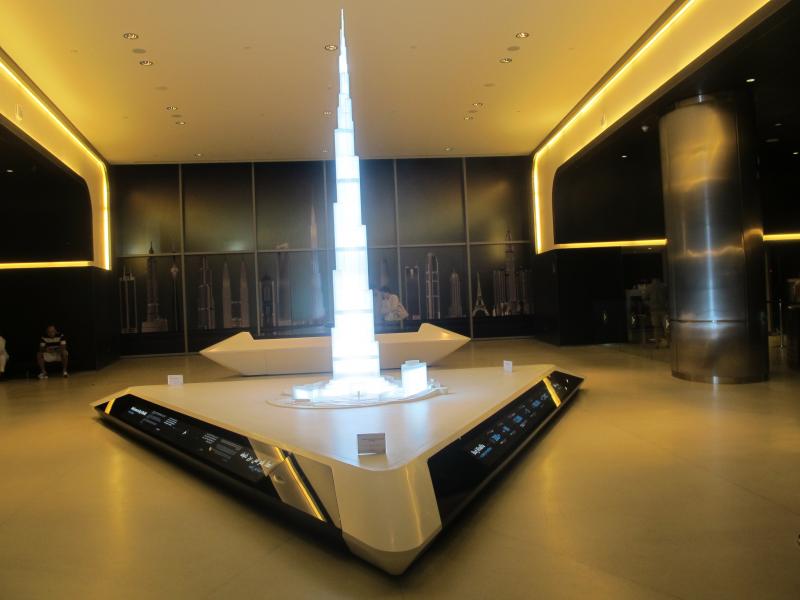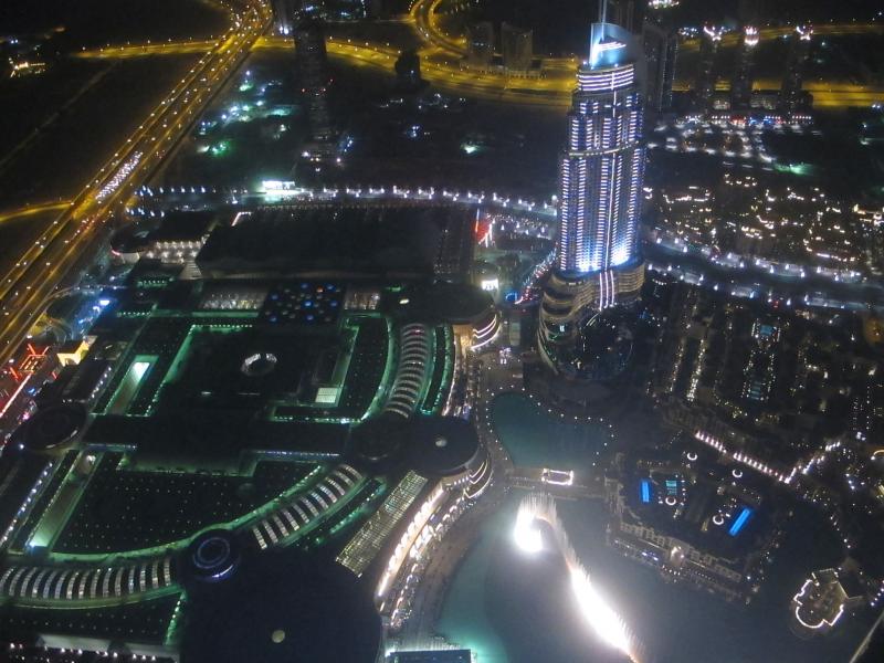 Müzik eşliğinde notalara göre hareket eden bir su gösterisi, oldukça kalabalık bir ortam. Asansöre binmeden Burj Khalifa maketi, yapım aşamasından görüntüler, mühendislik harikası bir geçmiş ile karşılaşıyorsunuz. Fotoğrafta yakın çekim olarak gördüğünüz Burj Khalifa katları aslında en üst katta olmadığımızı gösteriyor. Kafanızı kaldırdığınızda hala üzerinizde metrelerce yüksek bir yığıntı olduğunu fark ediyorsunuz. Yukarıdan çekilmiş fotoğrafta ise Dubai Mall'un D seklinde inşa edildiği ayrıntısını yakalayabildiniz mi ve tabii ki az önce yanında bulunduğumuz su gösterisinin 124. kattan yani yaklaşık 450 metre yükseklikten olan çekimi...