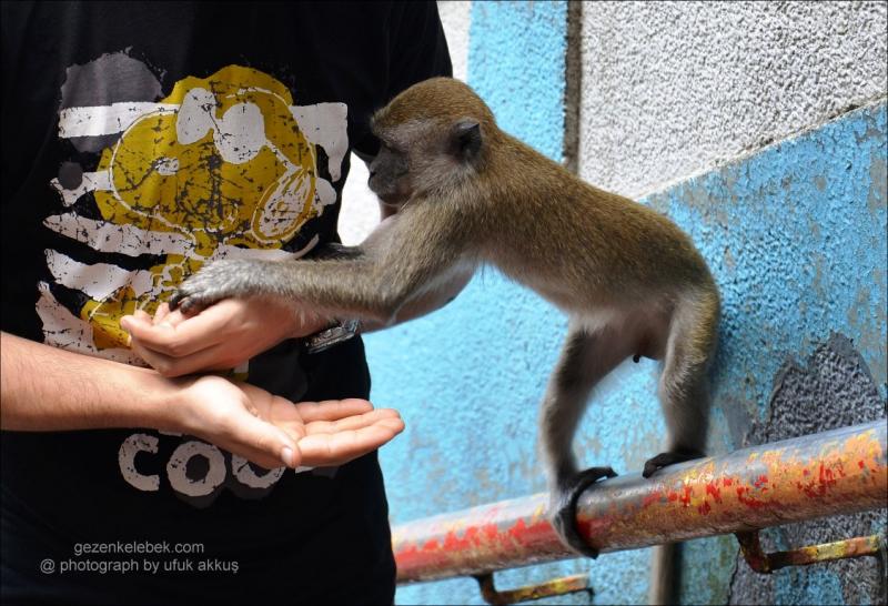 Batu Mağaraları merdivenlerinde turistlerin elindeki yiyecekleri alan bir maymun